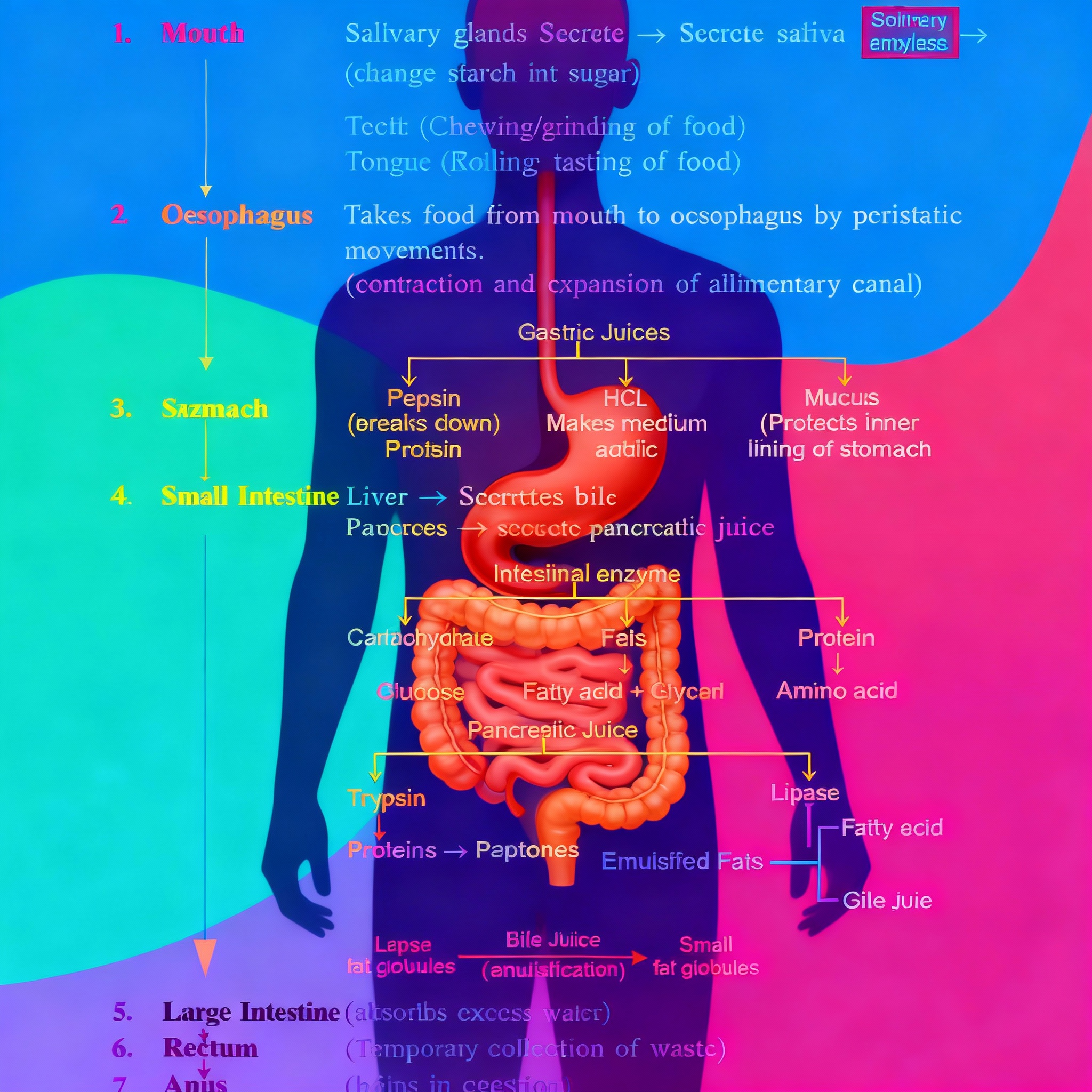 - Pancreas: Pancreatic juices (trypsin, lipase)